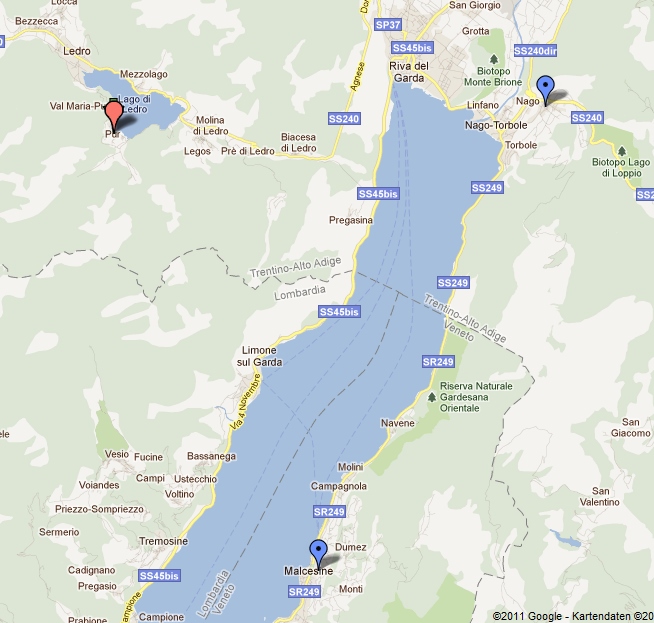 Unsere Unterkunft lag in Nago Torbole am nördlichsten Zipfel des Sees. Durch Torbole fließt die Sarca, der Fluss, der den Gardasee speist. Westlich von Torbole liegt Riva del Garda. Beide Orte sind vor allem bei Surfern und Seglern sehr beliebt, da es hier im Norden den besten Wind gibt. Schon früh morgens konnten wir von unserem Hotelbalkon aus die vielen kleinen Segel beobachten.